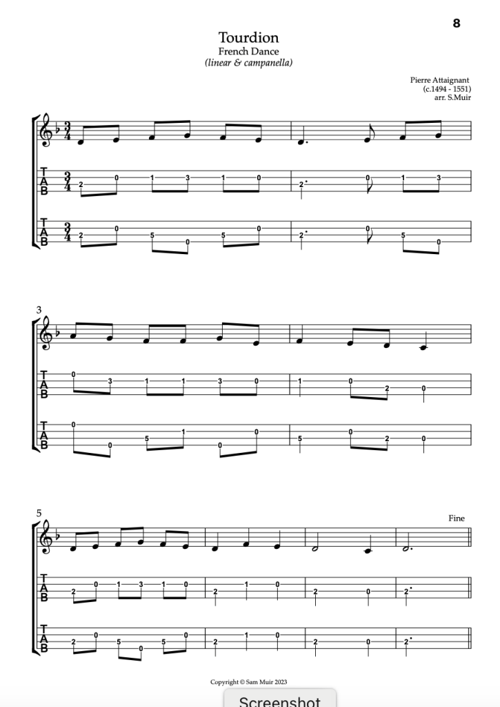 Campanella is an Italian word meaning ‘little bell’. It was originally used by Baroque guitar composers, such as Gaspar Sanz (1640 – 1710), to describe the over-ringing effects created when melodic notes are placed on alternating strings. We’ll explore this in more detail later.