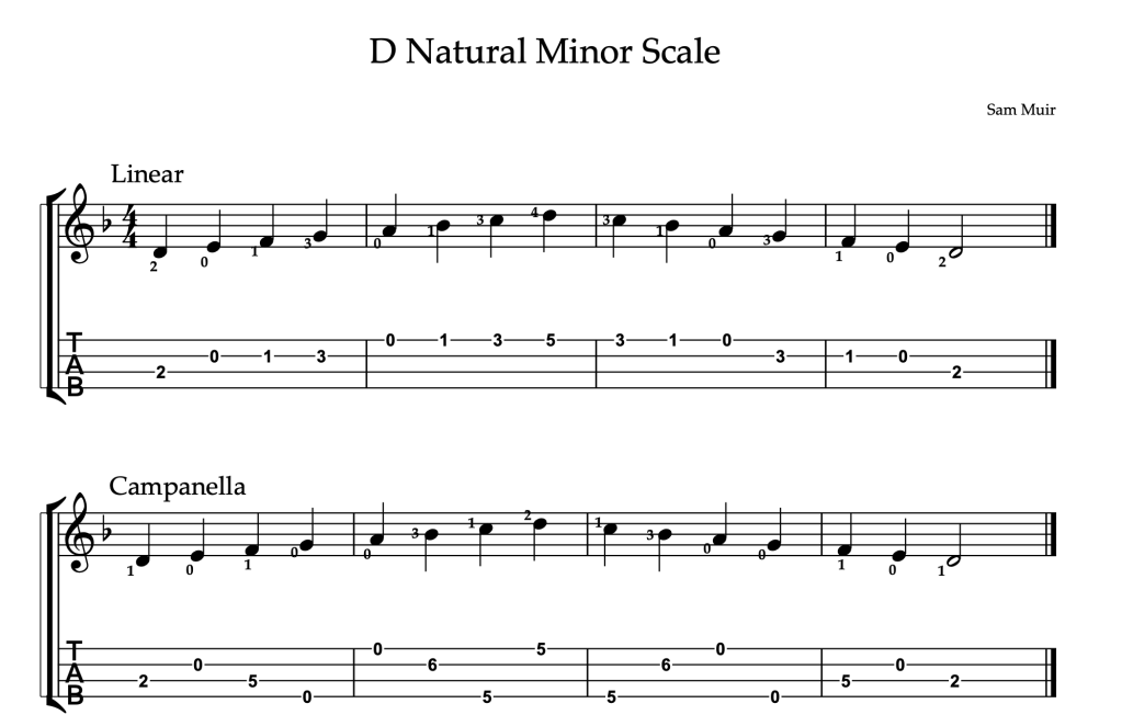 Okay! Let’s explore how campanella works. I’m going to use the D natural minor scale to demonstrate this technique. Before we get into the campanella version let’s play through the scale starting in first position. In this version the notes are ascending in a step by step motion across the fingerboard. As I play through the scale listen to how each note is clearly defined and sounds as an individual entity.